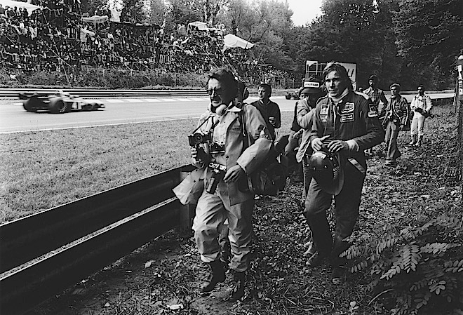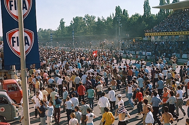 In the mean time, James Hunt, who'd been made to start at the back of the grid because he was racing in Italy and was main title rival to a Ferrari driver because of fuel irregularities, spun out, to the delight of the tifosi. His walk back to the pits (BELOW) past the jeering crowd was not without its perils, as you'd imagine. Meanwhile, Ronnie Peterson conquered all the big teams with his March (BOTTOM) and scored his third Monza win in four years. It would be March's final F1 victory.