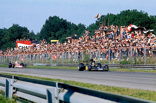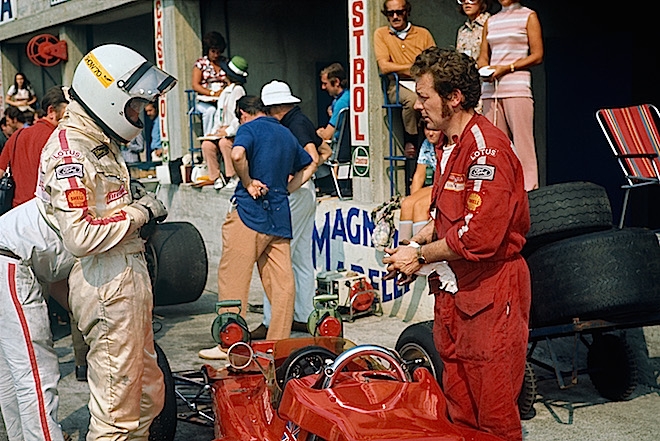 What a difference a day makes, as the song goes. On Saturday, Sept. 5, Jochen Rindt (ABOVE), championship leader, Lotus ace and possibly the fastest driver in Formula 1 at the time, crashed to his death when he hit the brakes and his wingless Lotus 72 veered off the track and into a guardrail at Parabolica. Here, he stands ready to head out with ace mechanic Eddie Dennis, as Chapman watches on.