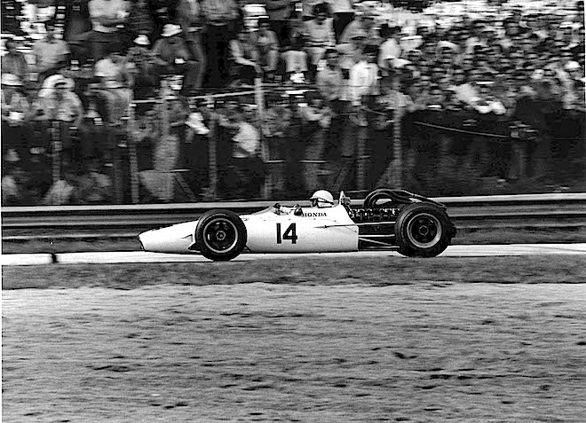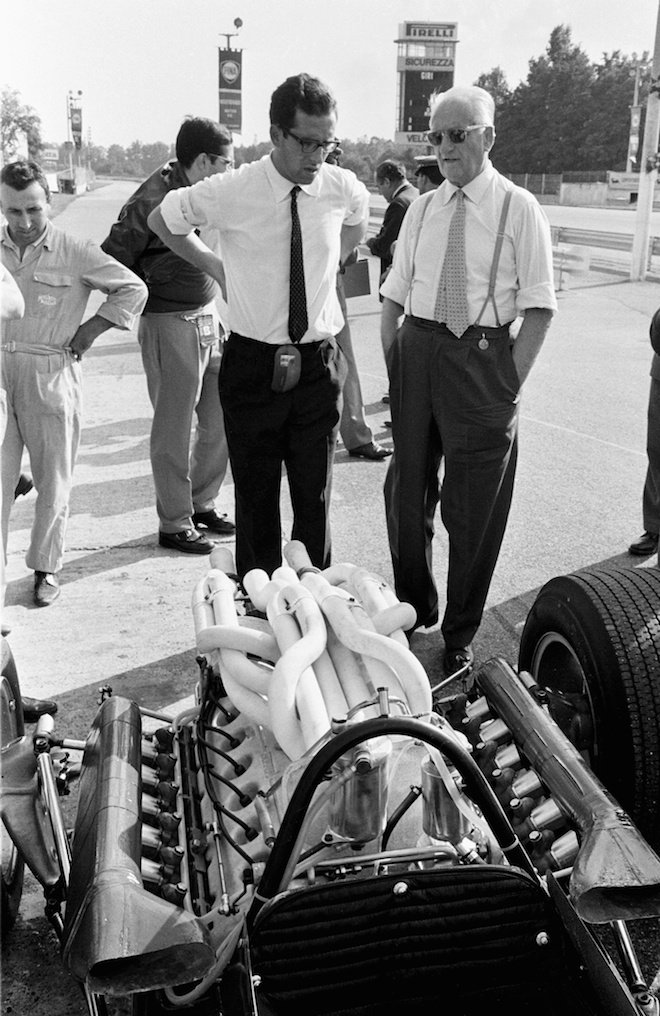 …(ABOVE) Lotus founder Colin Chapman and Clark with faces like they've just missed out on their greatest victory, but we suspect this was actually taken in practice…as was this picture (BELOW) of Enzo Ferrari making a rare trip to see his cars in action. Here he speaks with ace designer and engineer Mauro Forghieri. (BOTTOM) The pretty and victorious Honda RA300 of John Surtees, also nicknamed the Hondola, given that it was a Honda engine in an adaptation of a Lola Indy car chassis.
