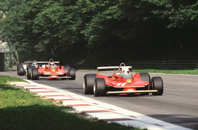 Ferrari's Jody Scheckter arrived at the Italian Grand Prix needing only four points to clinch the World Championship, at a time when points were distributed 9-6-4-3-2-1 to the top six. When the turbocharged Renaults of Jean-Pierre Jabouille and Rene Arnoux on the front row fouled up their start, Scheckter jumped into the lead (ABOVE), with teammate Gilles Villeneuve slotting into third. Arnoux whistled past the leader on the second lap, but when his Renault expired, Ferrari had itself a 1-2 and team orders were that whoever was ahead on assuming a that situation would stay ahead. Villeneuve dutifully followed his team leader to the checkered flag, finishing half a second behind the new World Champion, having earlier staved off the advances of Jacques Laffite's Ligier (tucked in behind, BELOW).