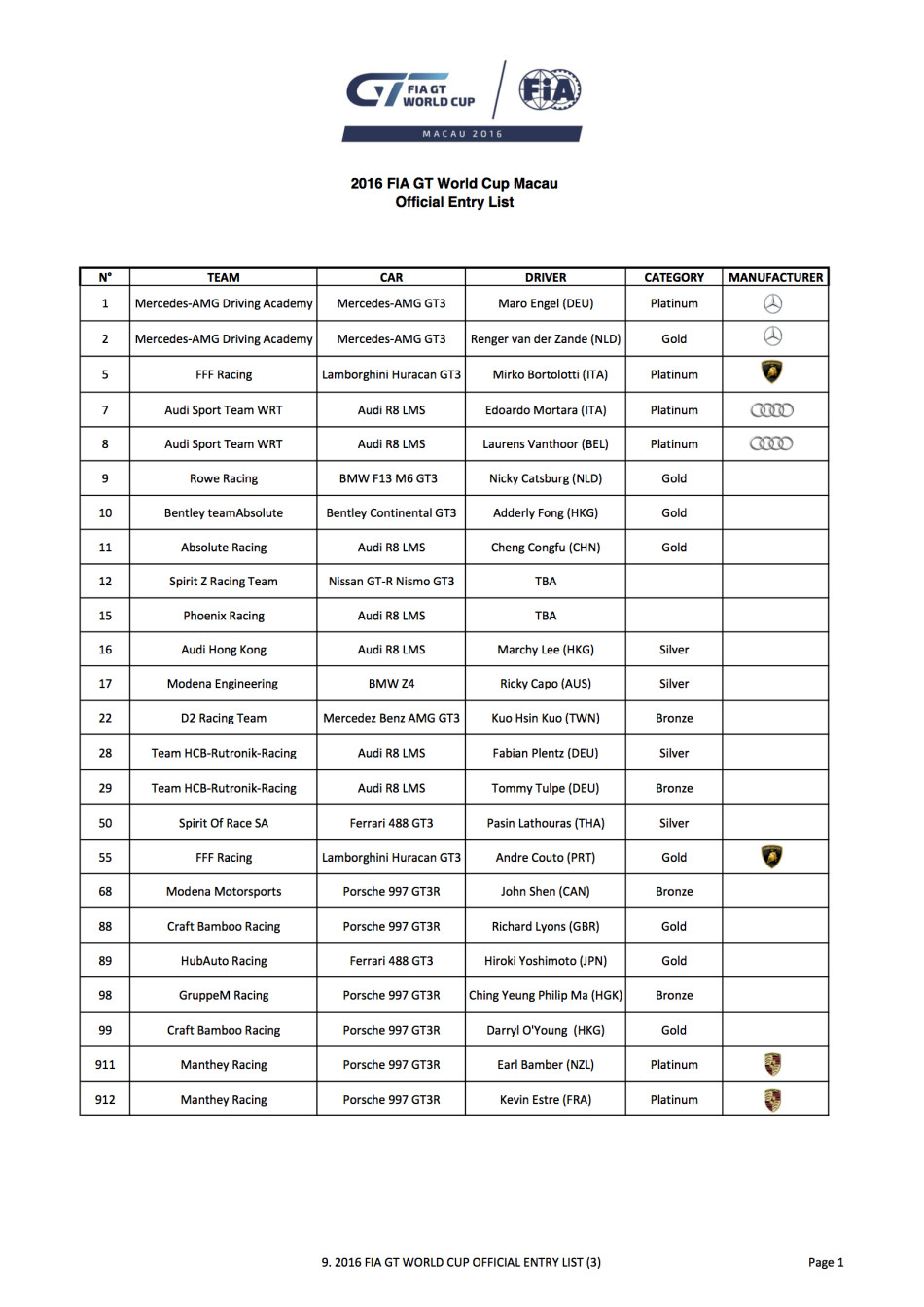 The leading GT3 series drivers from around the world are registered to contest the FIA GT World Cup title on the streets of Macao from November 17 to 20.