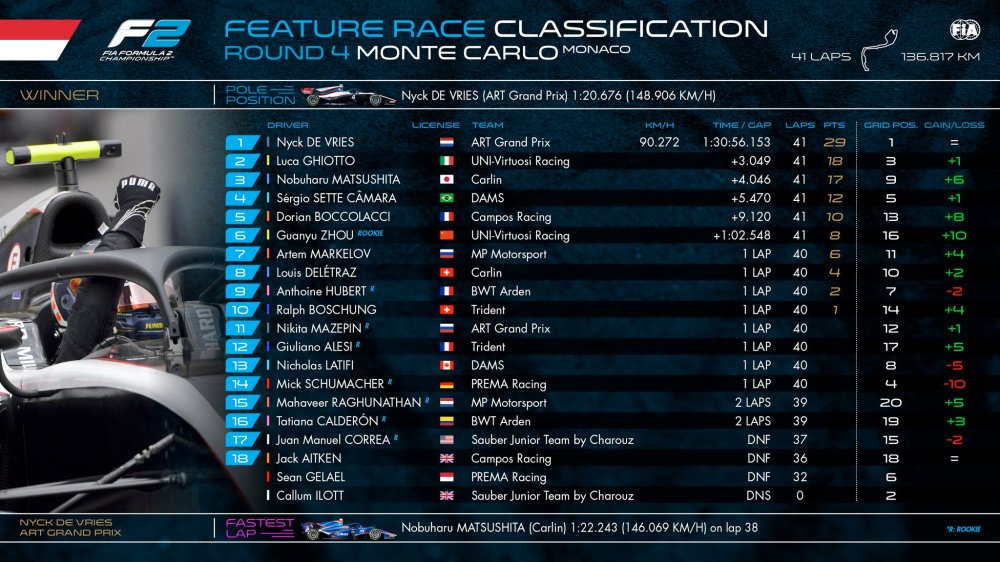 At the restart with only one lap to go, De Vries would not be denied what felt rightfully his: he remained calm and collected to stay ahead of the pack and take the checkered flag first. Ghiotto settled for second as Matsushita returned to the podium with third place. Sette Camara finished fourth ahead of Dorian Boccolacci, Guanyu Zhou, Artem Markelov, Delétraz, Hubert and Ralph Boschung.