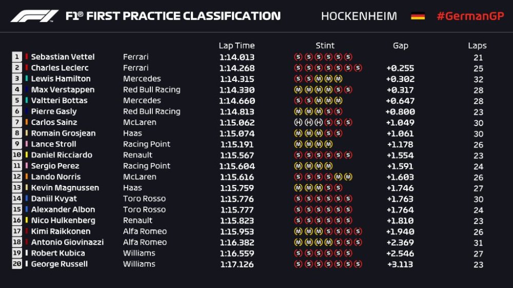 The home favorite was a quarter of a second clear at the top of the standings in extremely hot conditions, posting a 1m14.013s as temperatures reached 95F in the opening session. Charles Leclerc backed up his teammate with a 1m14.268s to finish second, although Ferrari used the soft compound tire compared to Mercedes on mediums.