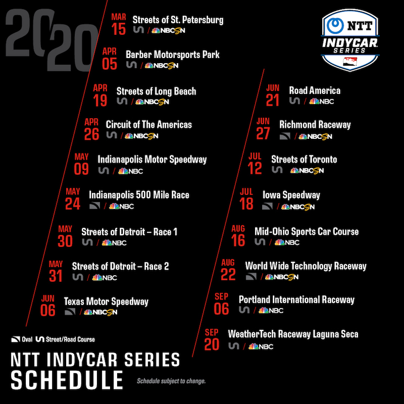 The 2020 NTT IndyCar Series schedule looks a lot like 2019, with the exception of Richmond’s racy oval returning and some shuffling to allow TV partner NBC to cover the Summer Olympics.