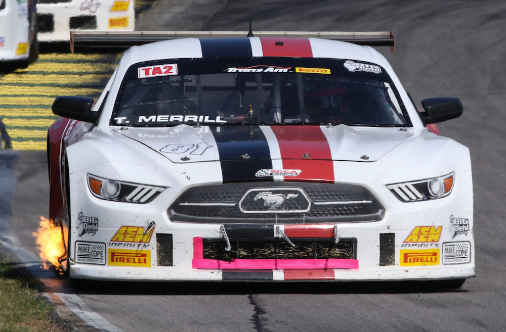 The dramatic TA2 race featured battles from front to back in the 25-car starting field, with Thomas Merrill (No. 81 Skip Barber Racing/Big Diehl Racing Ford Mustang) dodging multiple incidents including a frightening accident on the white flag lap to secure his third win of the season in a race that finished under yellow.