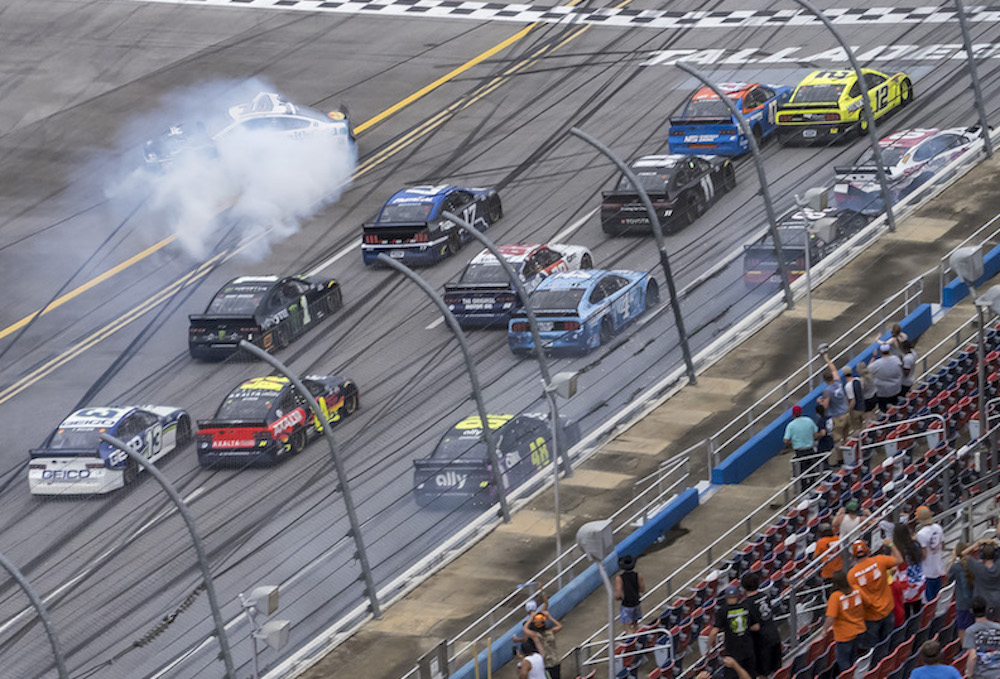 Blaney tried blocking Jones's run but the two collided, sending Jones bouncing off Nemechek and into the outside wall. In the ensuing chaos, Aric Almirola got clipped by Stenhouse and spun to the inside. But he still finished third, going backwards across the finish line.
