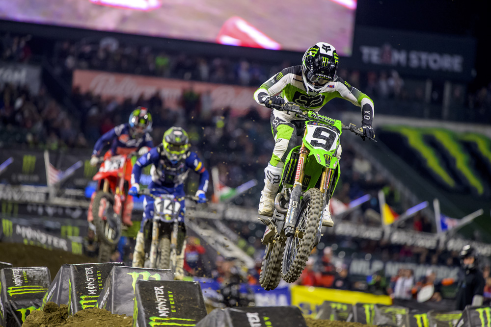 Adam Cianciarulo competed in his first AMA Pro Racing event in 2013 at Budds Creek Motocross Park. He placed 16th. Nine years, the 2019 Lucas Oil AMA Pro Motocross Championship 250, two career Lucas Oil AMA Pro Motocross Championship 450 wins and an astonishing number of dramatic highs and lows later, the kid from Port Orange, Florida is still fast at it. A member of the Monster Energy Kawasaki team, Cianciarulo was behind the starting gate inside overflowing Angel Stadium of Anaheim on Saturday night and despite the harsh reality that he’s still trying to bounce all the way back from a gnarly grade 3 separation of his AC joint, he took a hard-fought 11th place on his No. 9 Monster Energy Kawasaki KX450SR Special Racer.
