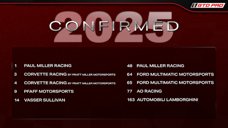 As previously announced, Paul Miller Racing will expand from one to two GTD PRO cars in 2025 alongside established two-car programs from Corvette Racing by Pratt Miller Motorsports and Ford Multimatic Motorsports. Pfaff Motorsports, Vasser Sullivan Racing and AO Racing also return with single-car efforts for the full WeatherTech Championship slate. Automobili Lamborghini will have a single-car effort for the Michelin Endurance Cup events.