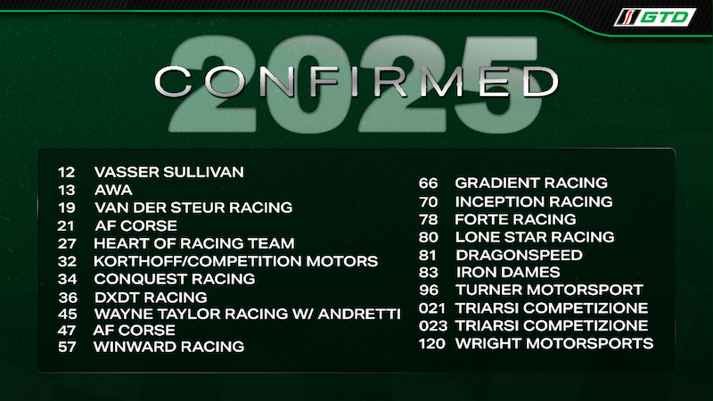 The WeatherTech Championship’s longtime most populous class, GTD, remains that way in 2025 with 16 full-season entries. Full-season, one-car programs are planned for AWA, Conquest Racing, series newcomers DXDT Racing, Forte Racing, Gradient Racing, Inception Racing, Korthoff Competition Motors, Turner Motorsport, van der Steur Racing – stepping up from the IMSA Michelin Pilot Challenge – Vasser Sullivan Racing, Wayne Taylor Racing, Winward Racing, Wright Motorsports, DragonSpeed, Heart of Racing Team and Triarsi Competizione.