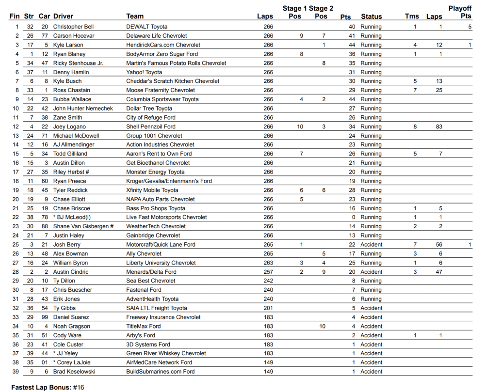 The final yellow flag flew to end the race when Josh Berry – who won Stage 1 -- Justin Haley and Ryan Preece collided on the backstretch during overtime.