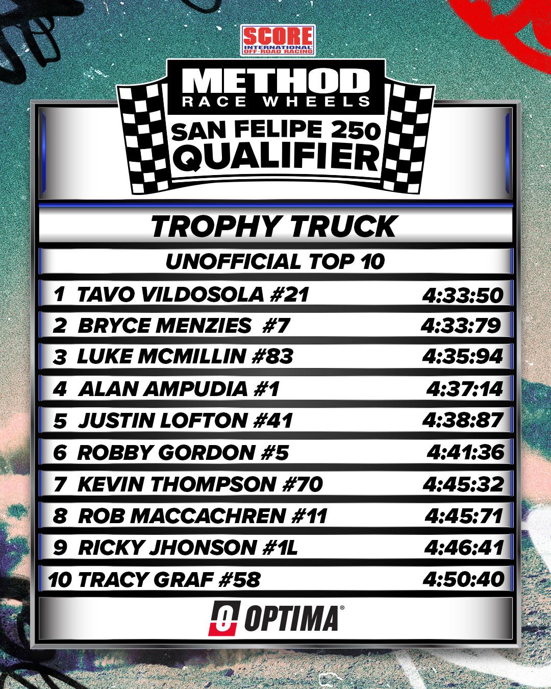 For 2025 SCORE International has broken up the entire unlimited Trophy-Truck field into three separate classes, SCORE Trophy Truck, SCORE Trophy Truck 2WD and Trophy Truck Legends for racers 50 years old or older. In addition, the more limited but growing ranks of the SCORE Trophy Truck Spec class is also in the mix for a top ten 10 overall finish.