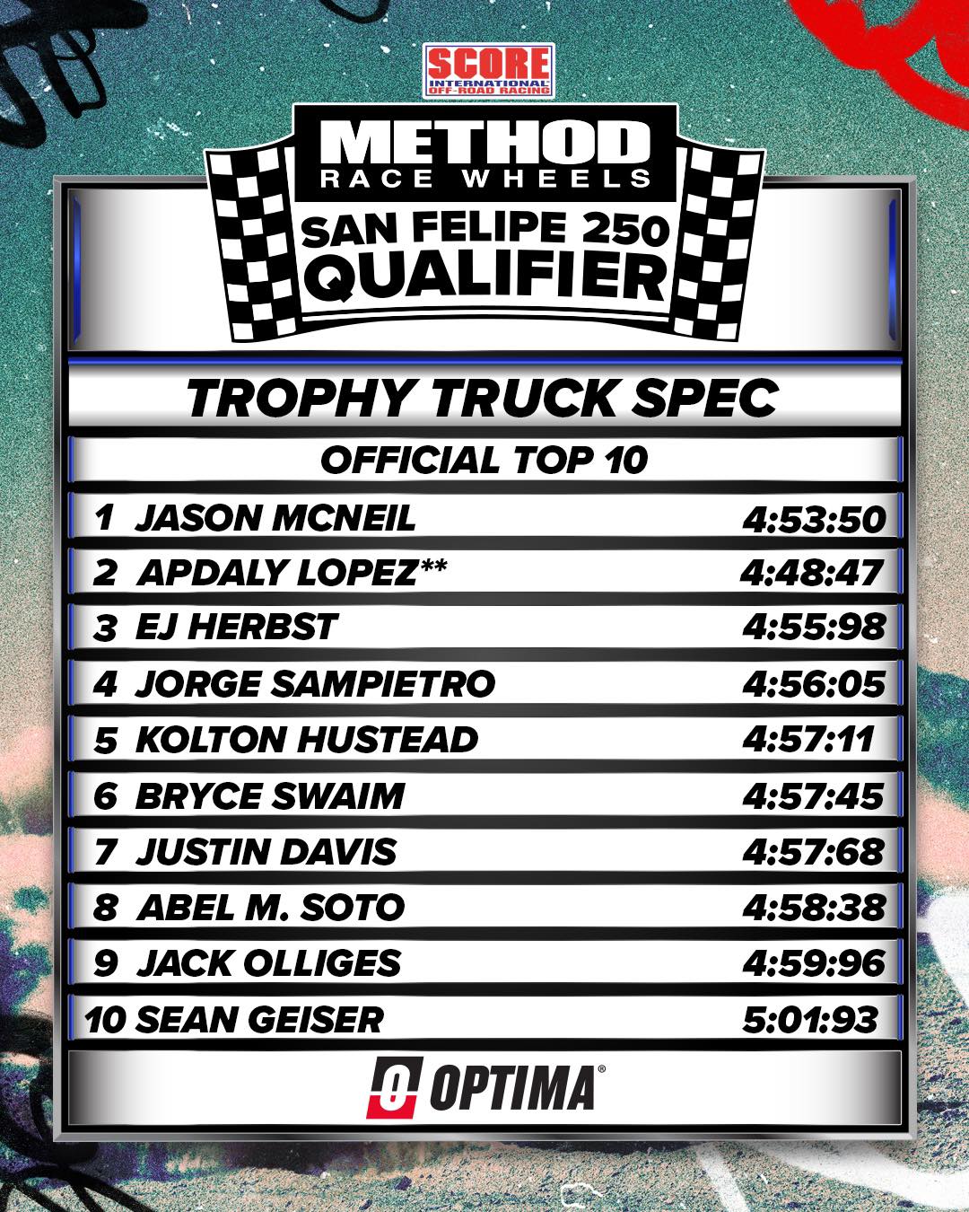 A rapidly deteriorating course throughout the day resulted in an unforeseen and eye-opening qualifying pace that saw the fastest Trophy-Spec time set by McNeil at 4m 51.501s would have placed him third in the SCORE Trophy Truck 2WD class and 14th overall. By rule, the SCORE Trophy-Spec category starts the race behind all the SCORE Trophy-Trucks and the unlimited Class 1 open-wheel cars.