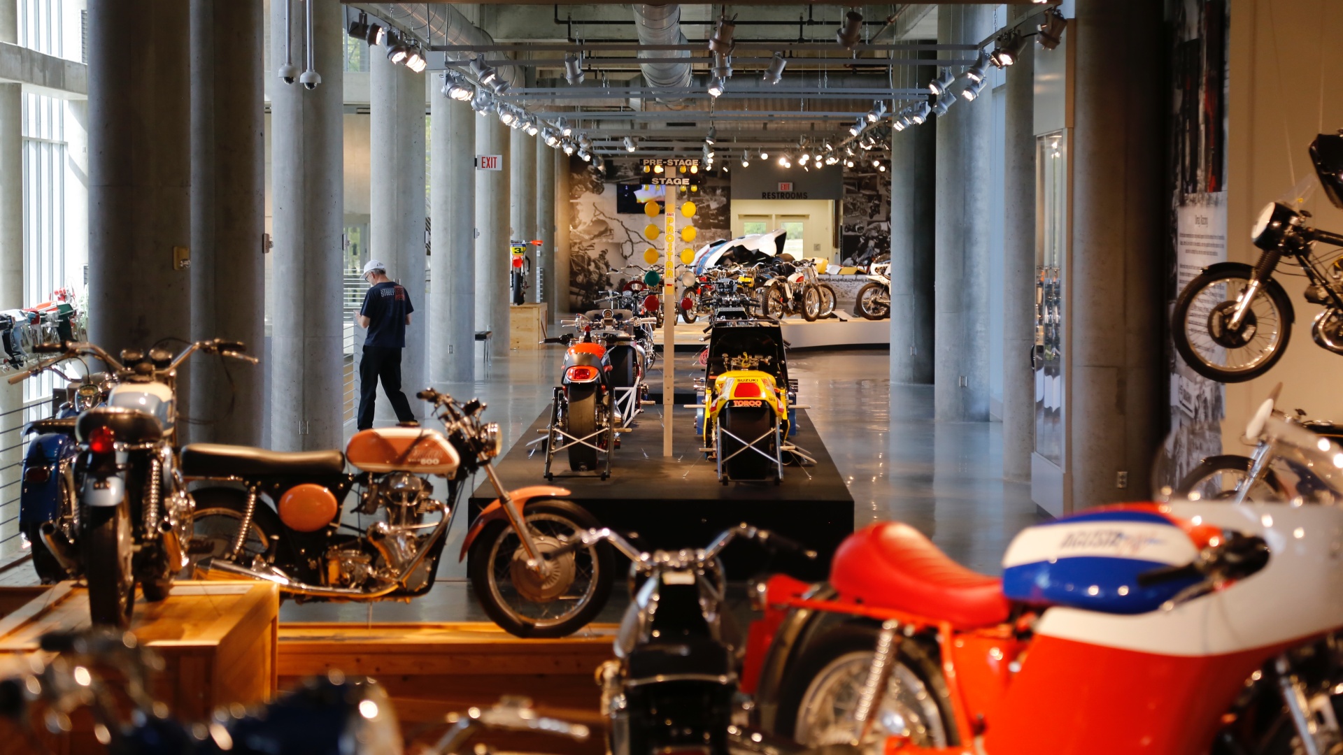 The museum maintains a vast majority of its collection in running, operational condition — meaning these are not crusty relics that have lost their purpose. They are living machines, maintained by a world-class in-house restoration team, and most of them could be fired up and ridden within the hour. The building itself is a five-story, glass-wrapped sculpture that feels more like a modern cathedral than a conventional museum, with bikes displayed on walls, suspended from ceilings, and arranged across open floors, all overlooking a stunning racetrack. It is, without hyperbole, unlike anything else on the planet.