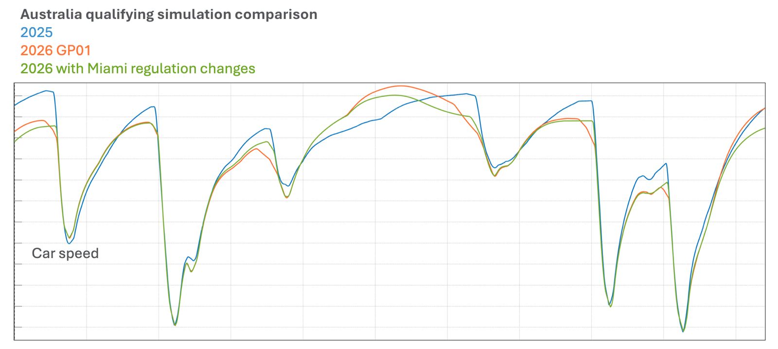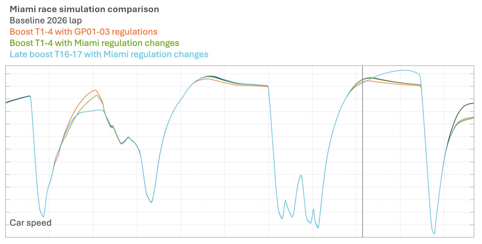 But that’s on a track that has already gone, so below is how Miami is expected to play out against what is deemed a baseline 2026 speed trace. Against that, a usage of the updated boost regulations in different sections of the track are displayed.
