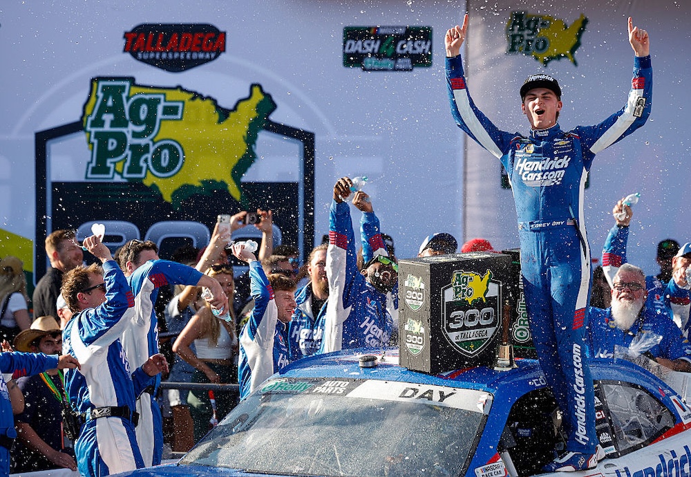 Corey Day claimed the first NASCAR O’Reilly Auto Parts Series victory of his career Saturday afternoon, driving to the yellow and checkered flags in the Ag-Pro 300 at Talladega (Ala.) Superspeedway – his No. 17 Hendrick Motorsports Chevrolet leading only the last lap to earn his first trophy in his first full-time season.